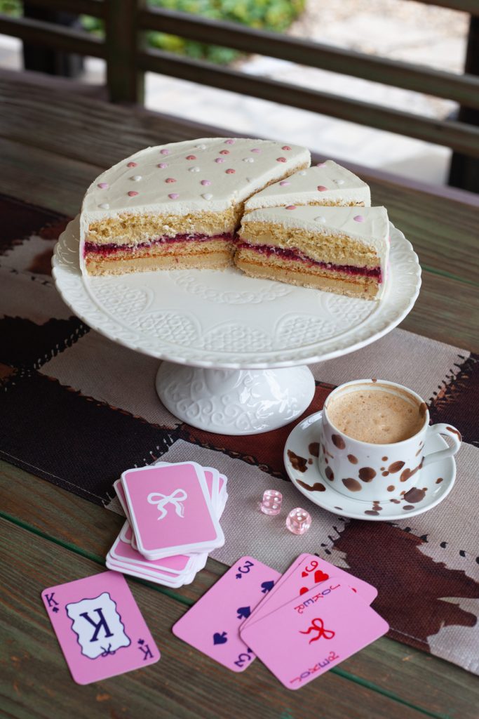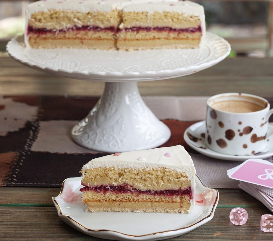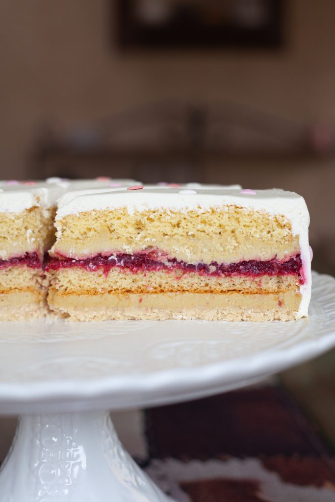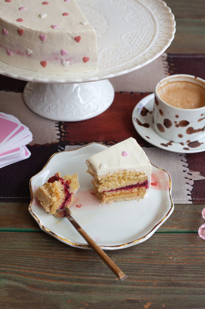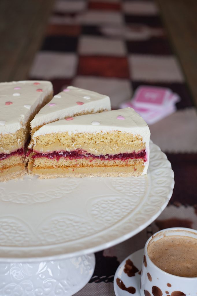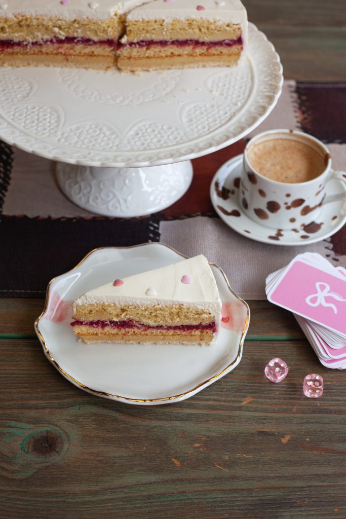 7. Zatim ide slaganje: na koricu od napolitanki rasporediti pola pistać fila, staviti jedan biskvit, malina sloj, drugi deo pistać fila i drugi biskvit. Tortu odložiti u frižider na par sati ili najbolje preko noći.